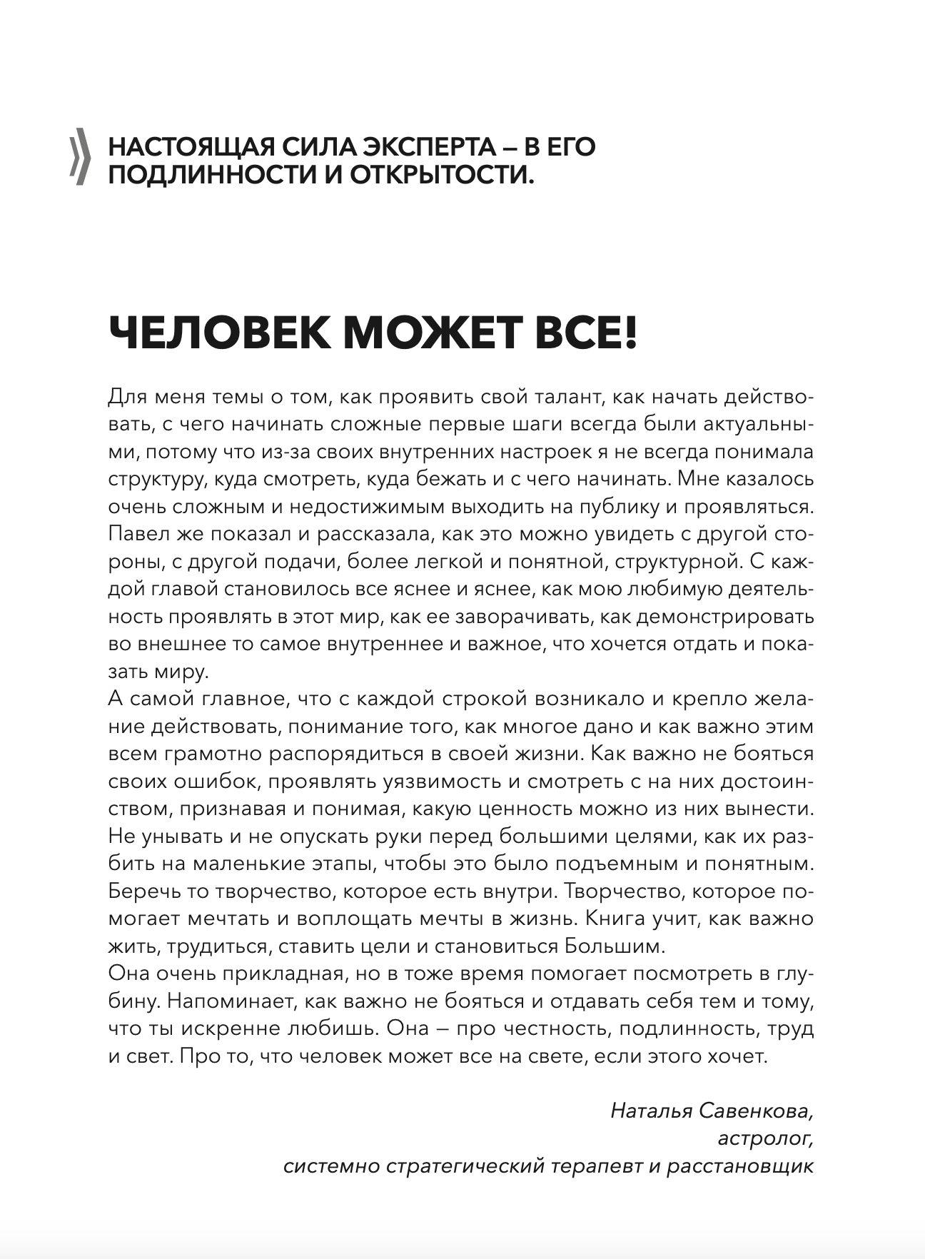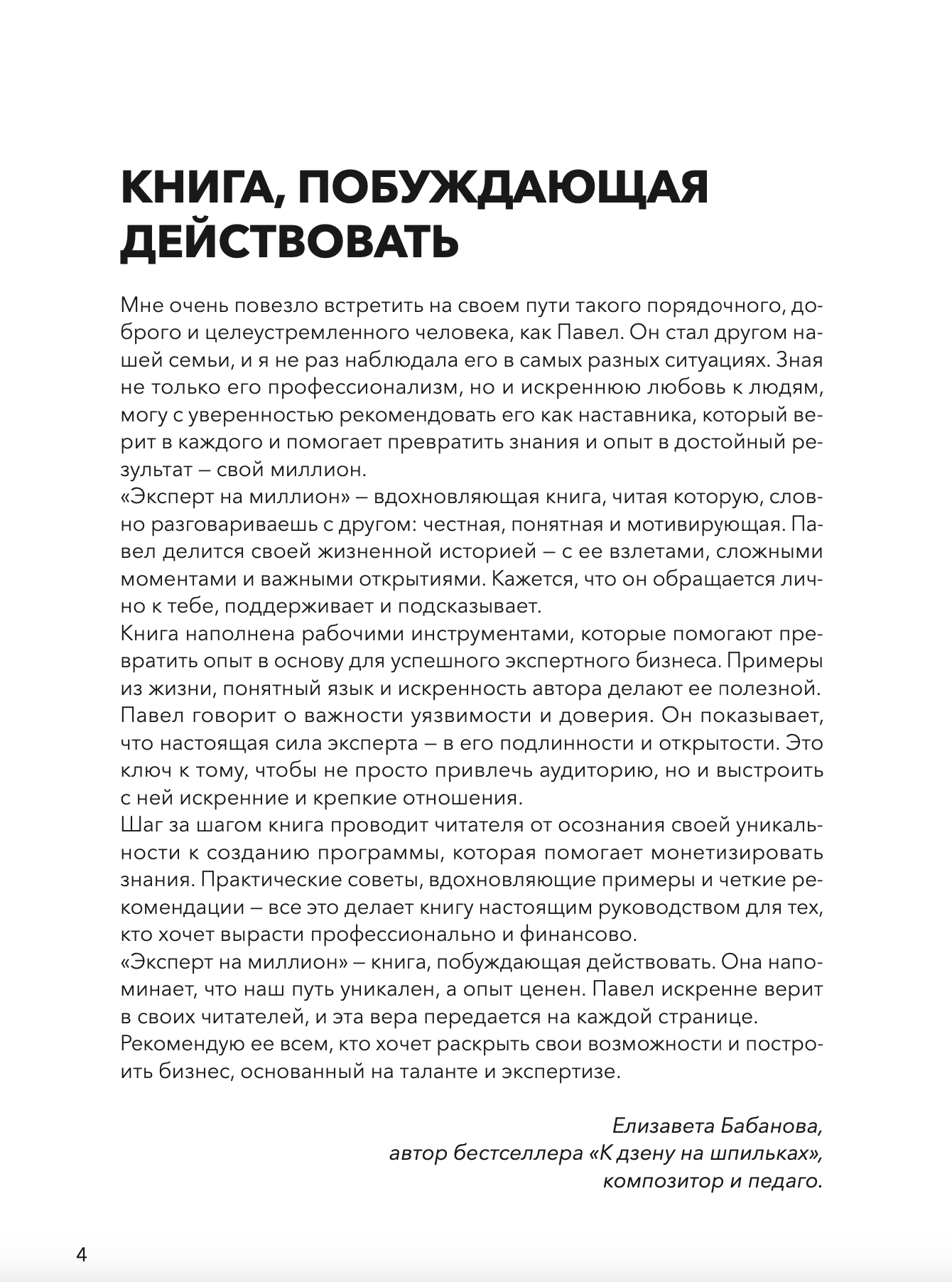 «Эксперт на миллион» — это вдохновляющая книга, которая словно разговор с другом: честная, понятная и мотивирующая. Павел делится своей жизненной историей — с её взлетами, сложными моментами и важными открытиями. Читаешь, и кажется, что он обращается лично к тебе, поддерживает и подсказывает. Книга наполнена рабочими инструментами, которые помогают превратить свой опыт в основу для успешного экспертного бизнеса. Примеры из жизни, понятный язык и искренность автора делают её лёгкой в чтении и очень полезной.