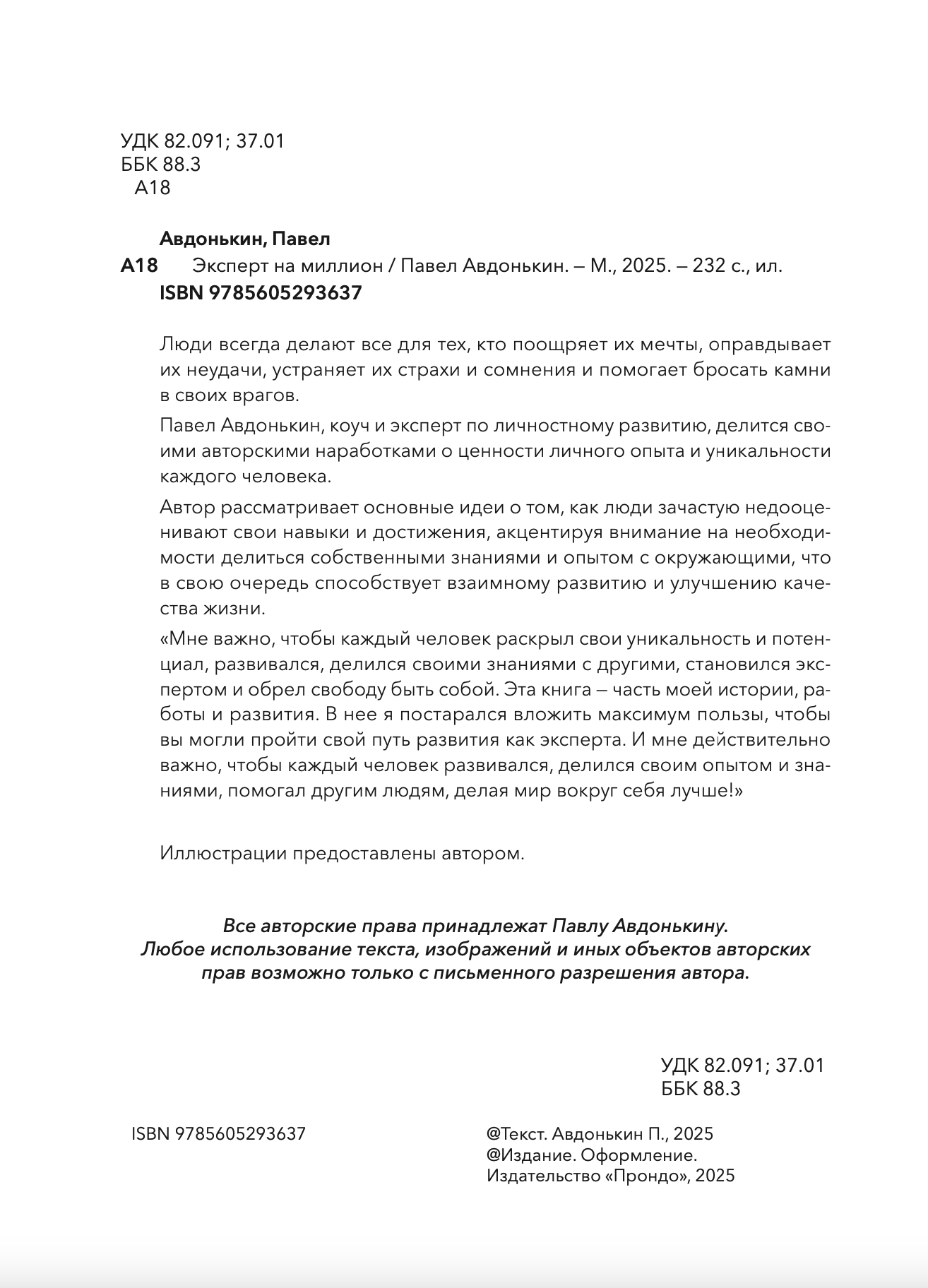 «Эксперт на миллион» — это книга, которая побуждает действовать. Она напоминает, что ваш путь уникален, а опыт ценен. Павел искренне верит в своих читателей, и эта вера передаётся с каждой страницей.